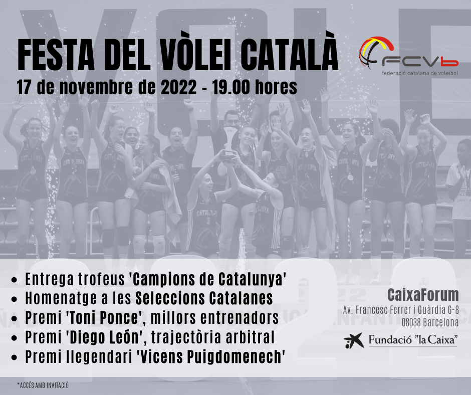 El proper dijous 17 de novembre es celebrarà, a l’Auditori del CaixaForum, la IX ‘Festa del Vòlei Català 2022’ en la que la Federació Catalana de Voleibol lliurarà els trofeus dels Campionats de Catalunya 2021/22, retrà homenatge a les Seleccions Catalanes de pista i platja, entre d’altres, i farà el lliurament de diferents premis destacats com el ‘Toni Ponce’, el ‘Diego León’ i el ‘Llegendari Vicens Puigdomenech’.