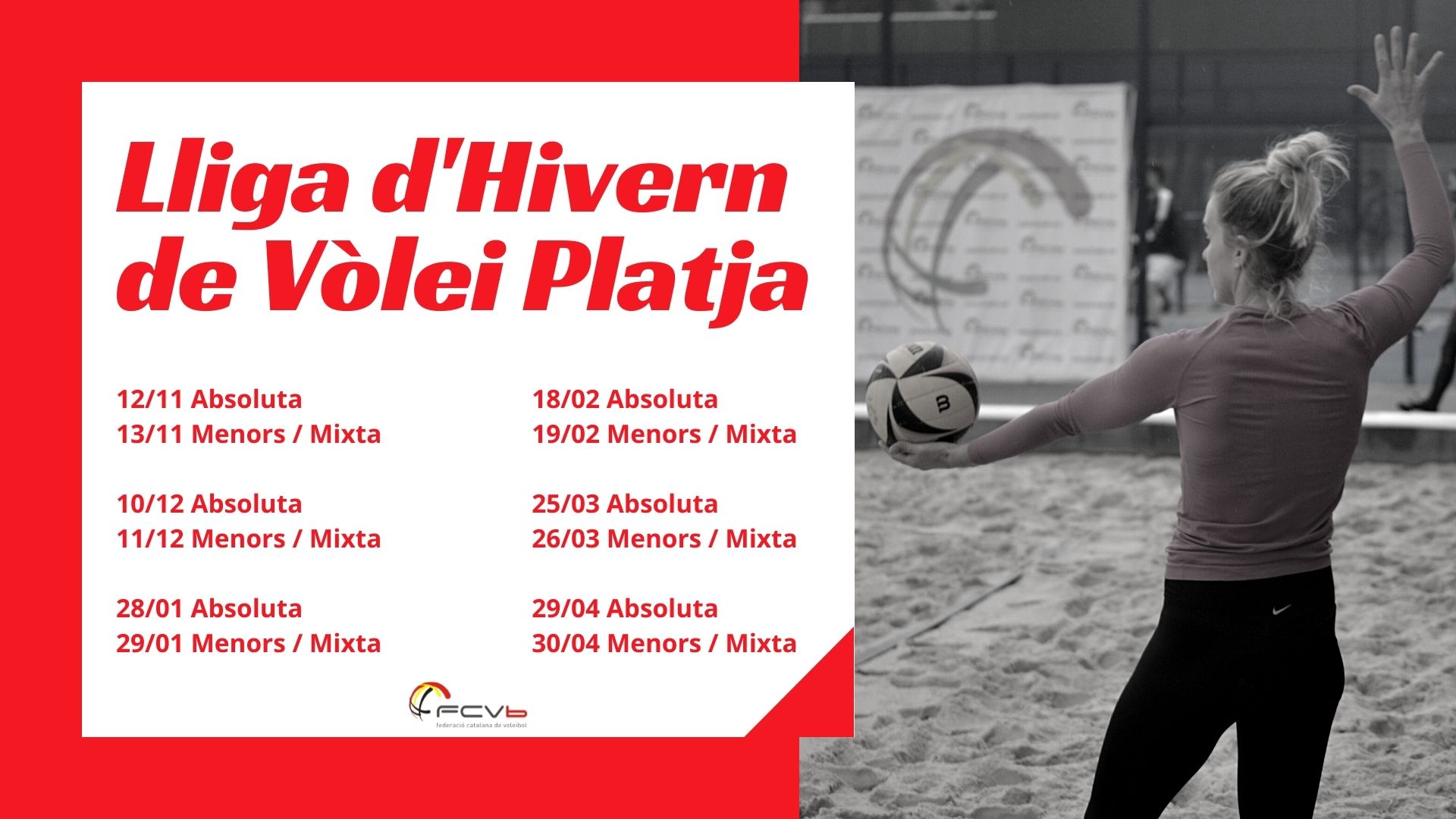 La Lliga d’Hivern de Vòlei Platja tindrà una prova per mes iniciant-se el 12 i 13 de novembre i finalitzarà el 29 i 30 d’abril. La resta de proves tindran lloc el 10 i 11 de desembre, el  i 29 de gener, el 18 i 19 de febrer i el 25 i 26 de març.