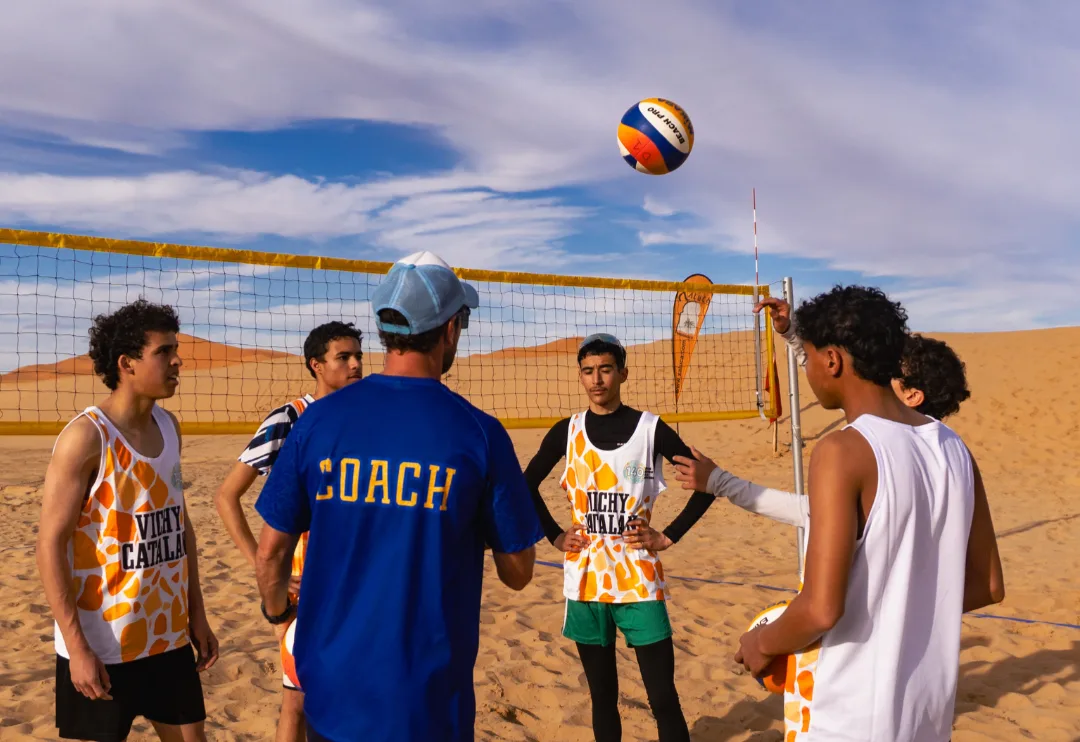 En col·laboració amb la Federació Catalana de Voleibol, mitjançant la cessió de material esportiu, i amb el club Amal Khamlia Sportive, es va organitzar una emotiva jornada de vòlei platja a les instal·lacions de l’Hotel Kasbah Tombuctoú (grup Xaluca). Una vintena de nens i nenes de la zona, de diferents edats, van poder gaudir d’una experiència única que va anar molt més enllà de l’activitat esportiva. Entre rialles, aprenentatges i moments compartits, la jornada va esdevenir un espai de trobada on es van fomentar valors essencials com la cooperació, el respecte, el treball en equip i l’entesa entre cultures a través del llenguatge universal de l’esport.