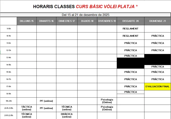 - El cap de setmana, dissabte i diumenge s’imparteixen les classes pràctiques, amb una disposició horària orientativa de 9:30h a 20:00h. Les classes presencials (obligatorietat d’assistència en un 85%) es desenvoluparan a la instal·lació esportiva corresponent. El format d’avaluació serà mitjançant exàmens i/o treballs, que al llarg de les classes presencials els mateixos professors aniran facilitant informació concreta dels seus treballs.