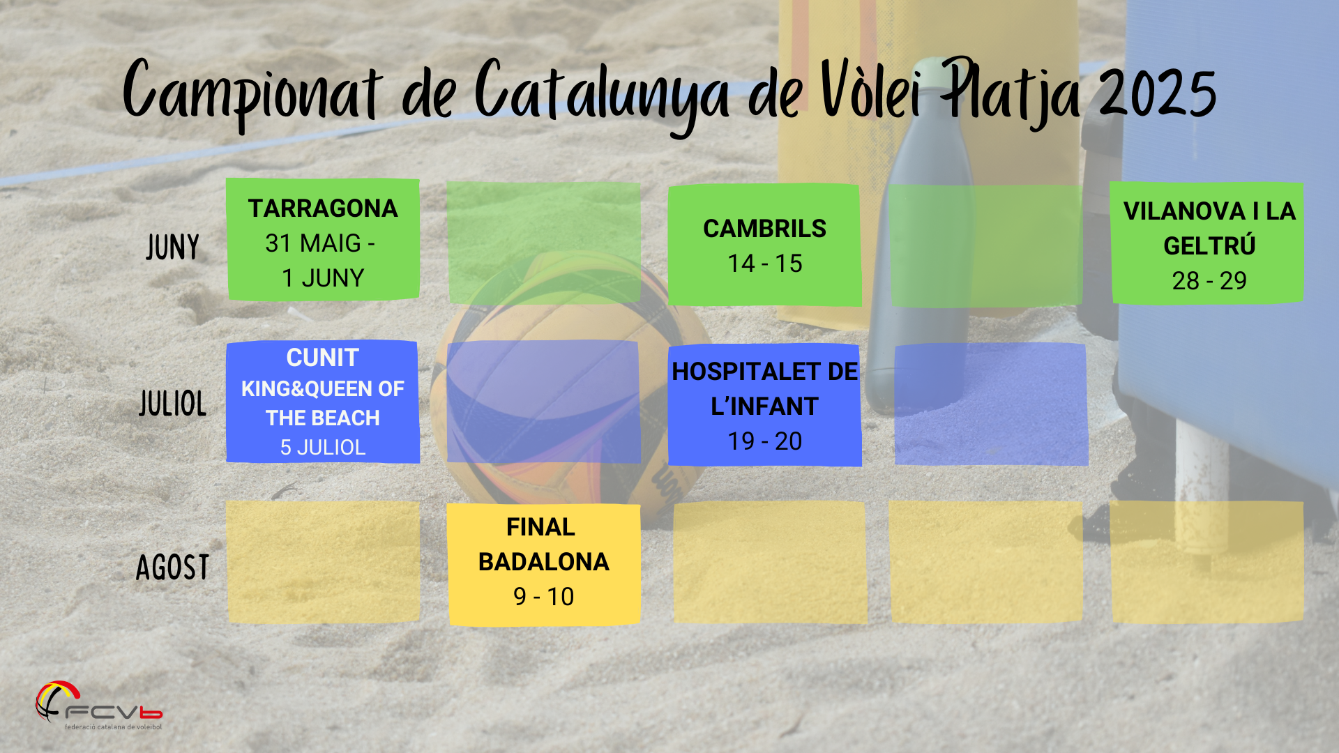 Un any més, el campionat català de vòlei platja recorrerà molts indrets de la costa catalana per tal d’apropar aquesta disciplina del nostre esport al màxim d’espectadors possibles. D’aquesta forma, el circuit començarà a la platja de l’Arrabassada de Tarragona en el transcurs de finals de maig i principis de juny, concretament els dies 31 i 1. Dues setmanes després, una localitat propera, Cambrils, acollirà la segona prova del certamen, disputada de forma íntegra a la Platja del Regueral amb les 16 millors parelles del rànquing per gènere. Vilanova i la Geltrú, ubicació habitual del torneig, tornarà a formar part del CCVP a finals de juny (28 i 29), abans de donar pas a les dues últimes proves del curs. L’Hospitalet de l’Infant mantindrà la seva plaça en el calendari, que tindrà lloc el 19 i 20 de juliol, abans de la gran final, celebrada a Badalona el 9 i 10 d’agost.