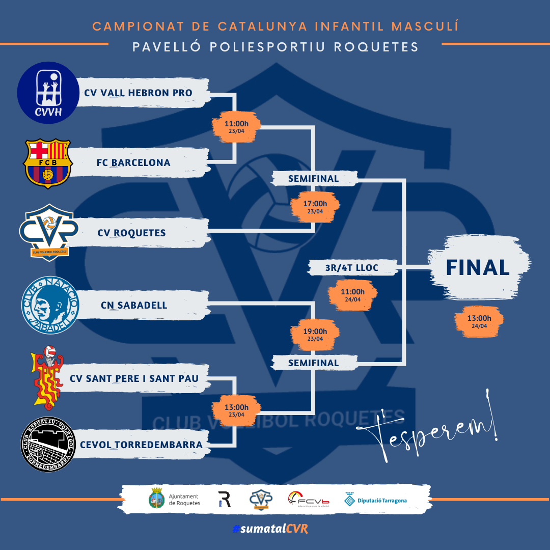 El CV Vall d’Hebron, el Barça Voleibol, el CV Sant Pere i Sant Pau, el CEVOL Torredembarra, el CV Roquetes Blanc i el CN Sabadell son els sis equips que participaran a la fase final infantil masculina. El primer partit de quarts de final serà dissabte a les 11 del matí entre els de la Vall d’Hebron i els blaugrana, mentre la segon serà a les 13 hores i enfrontarà als dos equips tarragonins, els cooperativistes i els torrencs. A semifinals, que es disputaran dissabte tarda esperen el CV Roquetes, equip amfitrió i el CN Sabadell.