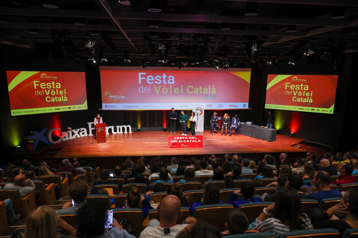 Prop de 350 persones, entre jugadors, entrenadors, directius, convidats i acompanyants, van poder gaudir d’aquest acte que per primera vegada es celebrava a l’Auditori del CaixaForum. Un espai únic on, de la mà del Sr. Aleix Villatoro, director del Consell Català de l’Esport; del Sr. Gerard Esteva, president de la Unió de Federacions Esportives de Catalunya; i de la Sra. Maribel Zamora, presidenta de la Federació Catalana de Voleibol; es va fer entrega dels diferents guardons. Els primers en sortir a l’escenari van ser els equips Campions de Catalunya de la passada temporada. Més de 30 equips de 18 clubs diferents van pujar a l’escenari per rebre el seu trofeu de campió.